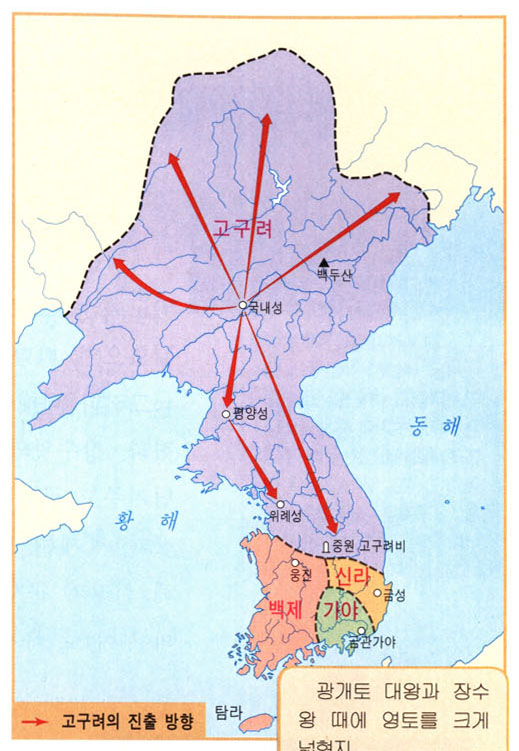 [5세기 당시 고구려, 백제, 신라의 세력권을 나타내는 지도]